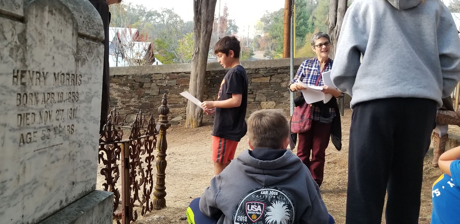 In preparation for our upcoming unit on the Great Migration and the influence of Jewish culture on American music and culture, Shiraniks and their parents joined the other 5th and 6th grade classes on a field trip to the gold rush town of Columbia, with a stop at the Jewish cemetery in Sonora on the way home. We learned a great deal about how the Jews contributed to California's historic gold rush, and the students enjoyed getting a taste of life back in the mid 1800's. Charna came back to JQuest for this special event, which she has organized for many years. While on the bus, we tried to ignore the smoky skies outside while we watched a film about the Jews of early California. Then, after stopping for a quick lunch in Sonora, we met with the docents of Columbia